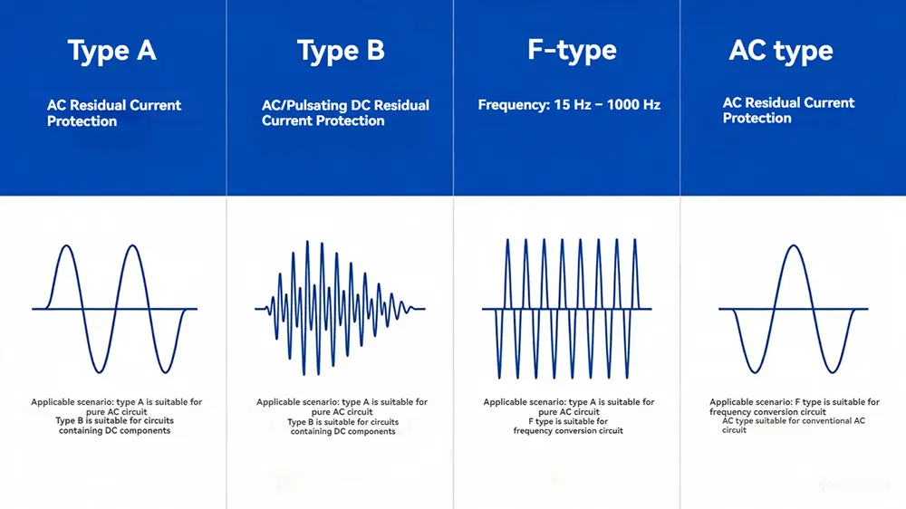 | Tip curent rezidual | Tip AC | Curent rezidual sinusoidal AC; pentru iluminat general, prize și sarcini rezistive. |